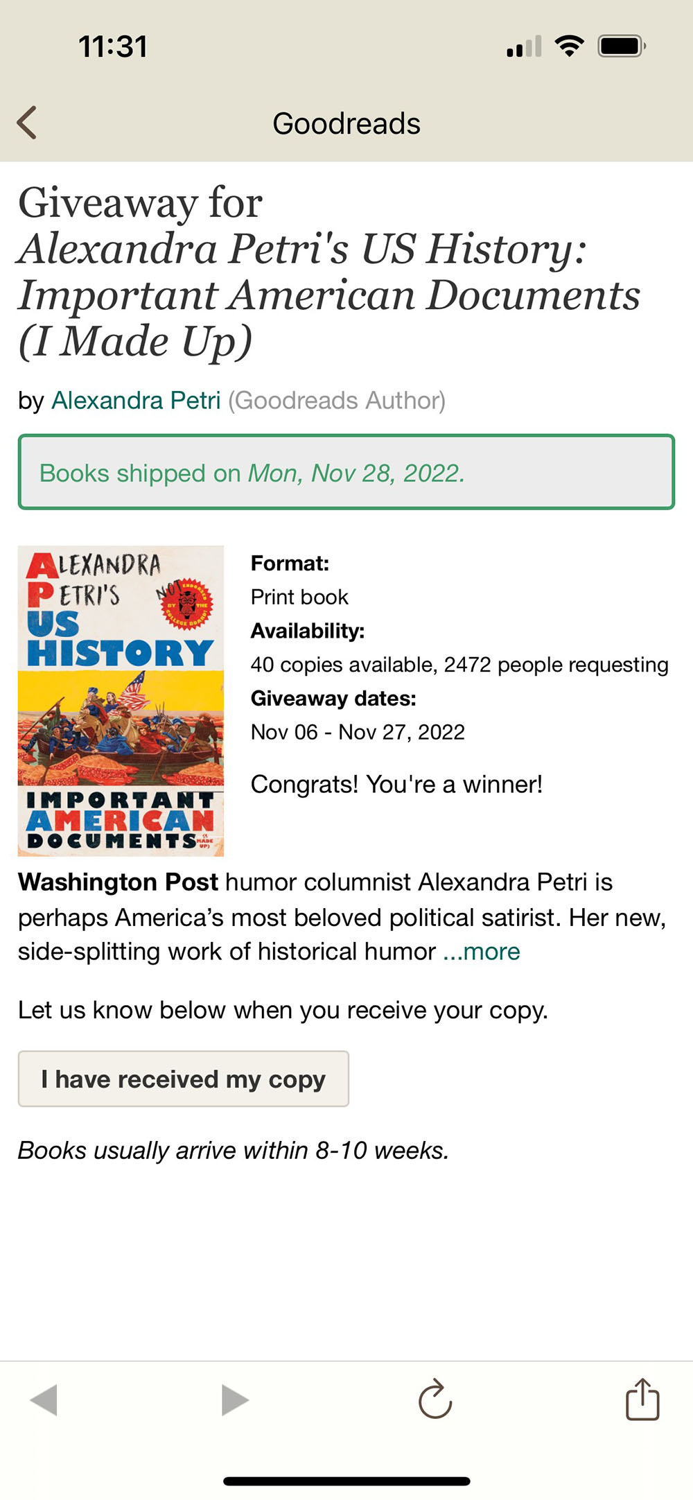 In brighter news, I have entered at least a dozen Goodreads giveaways, but this is the first one where I’ve actually won something!