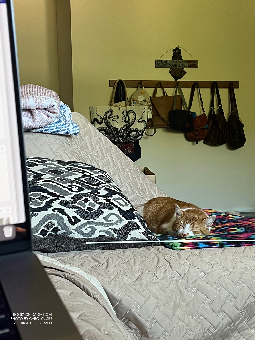 - He likes taking naps on his tie-dye blanket, which I set up on the end of the chaise in the hopes that he would find it an agreeable spot for lounging.