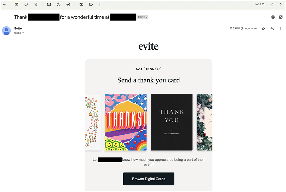 In conclusion, go fuck yourself, evite. You absolutely need to give me the option to unsubscribe specifically from this bullshit, especially if it’s something that is sent automatically without the knowledge of the host. I don’t care if the email is considered “transactional.” The fact that it is unblockable is unforgivable, because this is the stupidest fucking product idea I’ve ever seen.