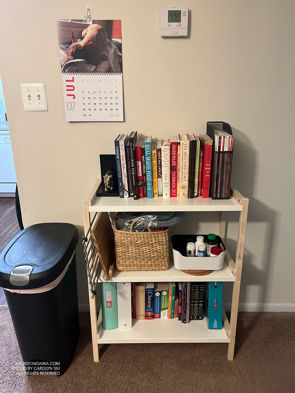 This has been such an irritating month. If I had to pick, I think July and August might be my least favorite months in general. The best thing to come out of this particular July is my new kitchen bookcase. My back did not thank me for carrying the bookcase boxes up three flights of stairs, but it was totally worth it. The relocation of the cookbooks freed up space on my manga bookcase for my poetry/theater section, which in turn opened up almost a whole extra shelf for my nonfiction section, and, thanks to an aggressive unhaul, I have managed to squirrel away every new book I have bought this year. Bookcases are wonderful things. What with the new amount of space, I might move the reference books and the lonely Magicians trilogy from this little bookcase back to the main bookcases, but that’s a problem for another day.