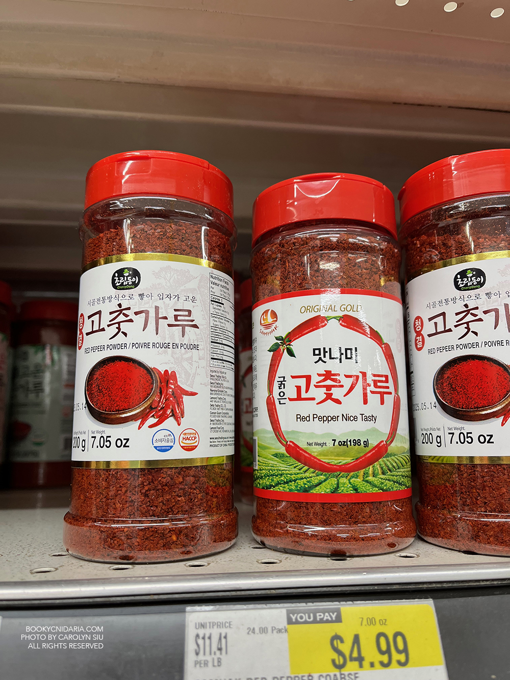 I was at H Mart yesterday, and I saw some hilarious labels on the gochugaru jars while I was in the spice aisle, and then some “chicken paws” in the freezer section. I love Asian markets.