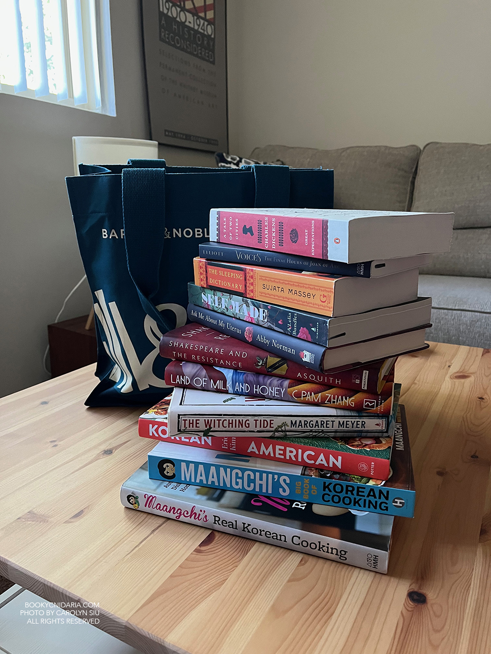 In book-related hauls, you may start noticing a pattern right about now, because I haven’t been to the bookstore recently but had to reset the counter after this weekend. The top of the stack came from the Green Valley Book Fair; the bottom half – starting with Land of Milk and Honey, whose release I have been anticipating – came from Barnes & Noble, which just happened to be in close proximity to the H Mart. I got suckered into the new membership at the register, so I got a free tote as well and was promised another one when I renew next year.