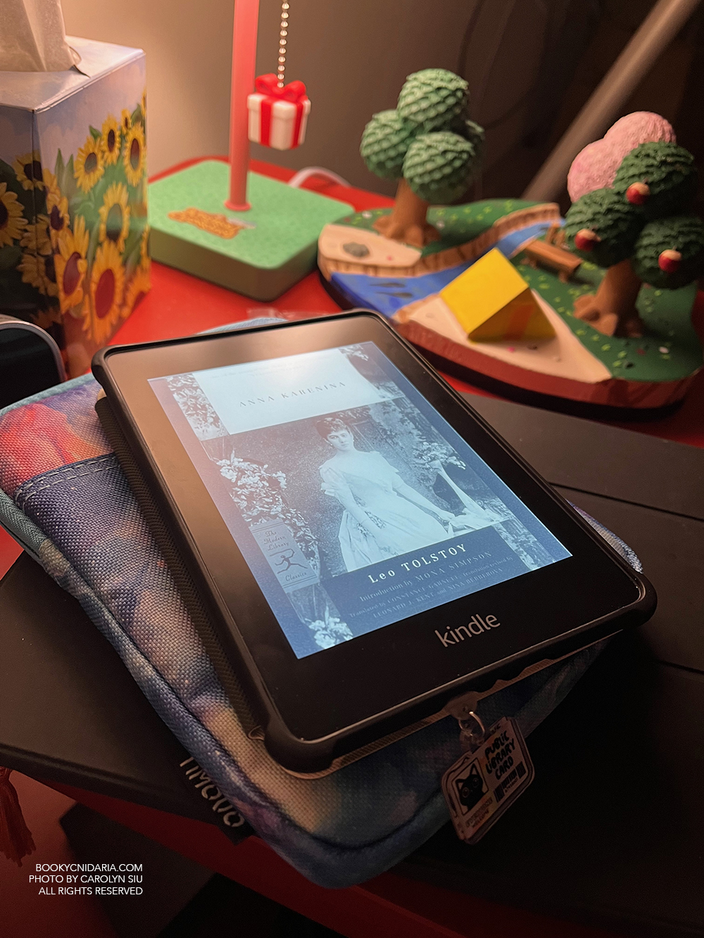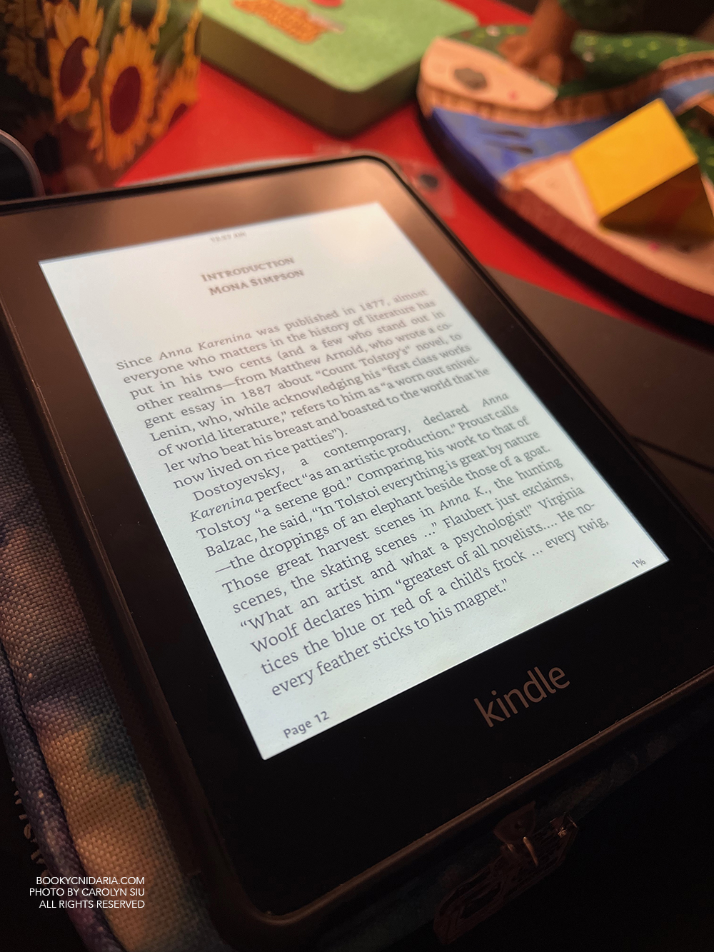 One decision I do not regret: reading Anna Karenina on Kindle. I am tired of holding up 1,000-page books and trying to keep them from dropping onto my face, and I love the Kindle’s annotating abilities so much. My notes and highlights are here.