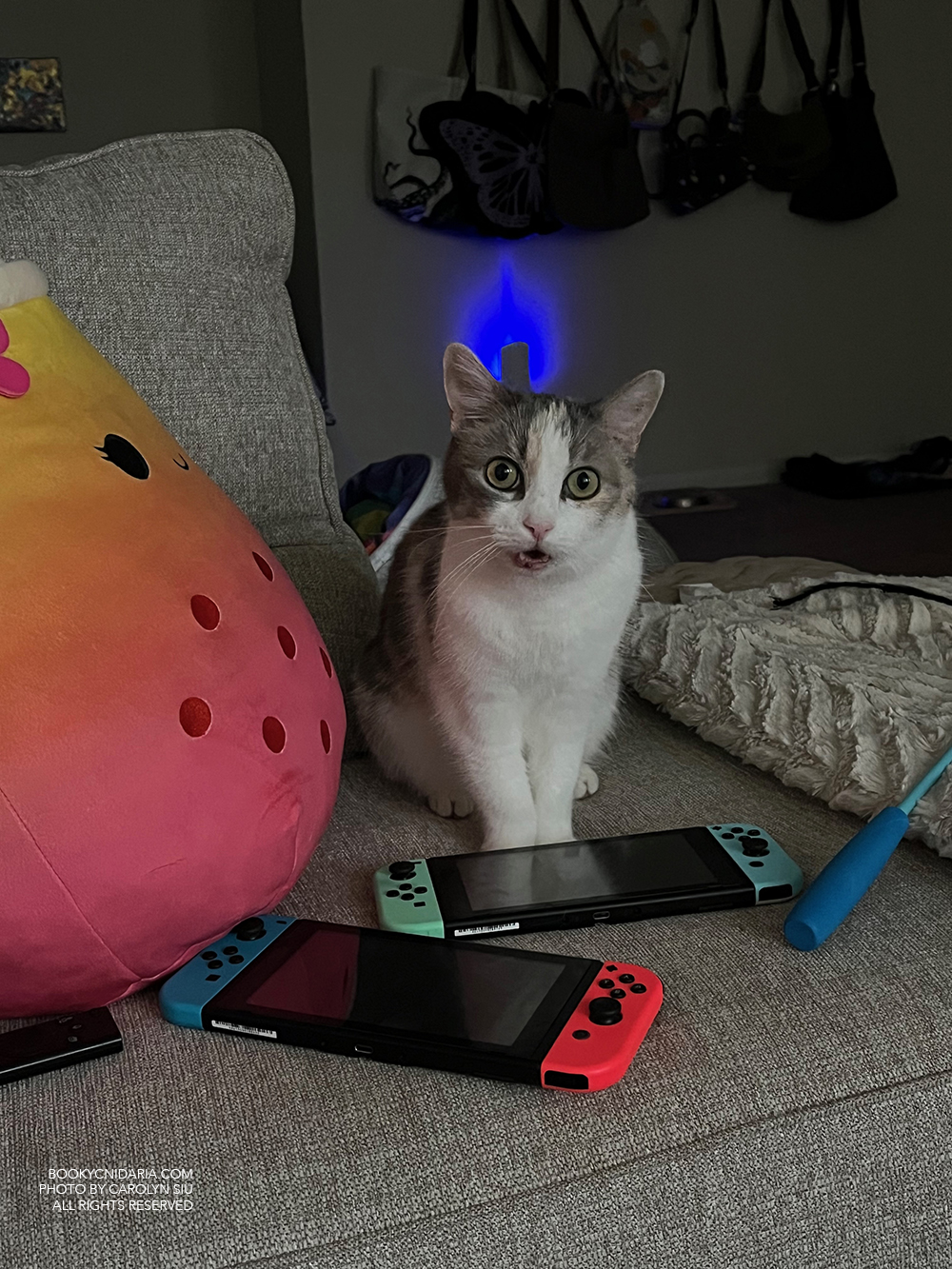 Circe, of course, has other problems, as it now turns out that she can be trapped by video games. Here she is complaining loudly to the cruel hooman who let her get stuck behind the two Switches and then took pictures like a sadist.