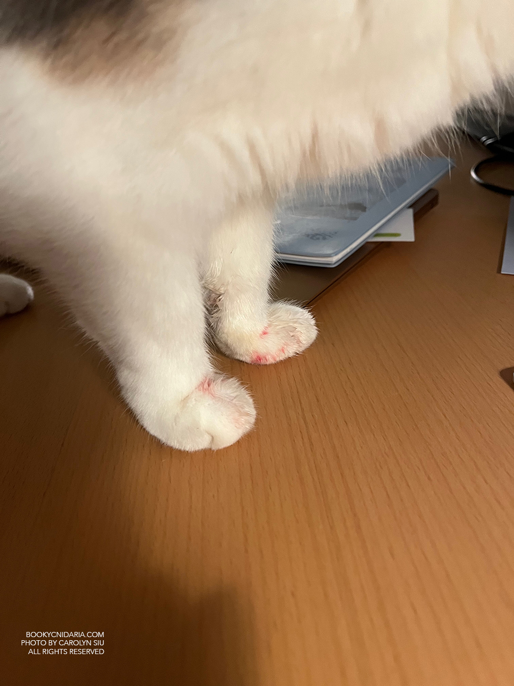 HEAR YE, HEAR YE: My cat is a drama queen, and I am a hypochondriac by proxy. This led to a terrible, horrible, no good, very bad Saturday night for both of us, but guess what happens when we nibble our little paws raw? Mommy panics and drugs us and takes us to the ER. That’s what happens. IN MY DEFENSE, I noticed in the late afternoon/early evening that her paws were covered with blood stains. I thought maybe those were mine because she claws me every morning before breakfast, but I don’t bleed that much and her paws have never looked that bad before, and then I noticed she was biting at one of her dew claws like she was trying to pull it out. I’ve seen her do that before, but never to the point of making herself bleed.