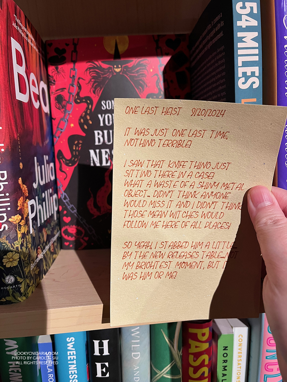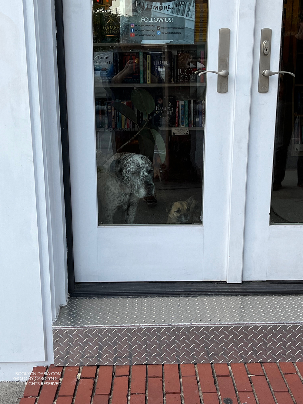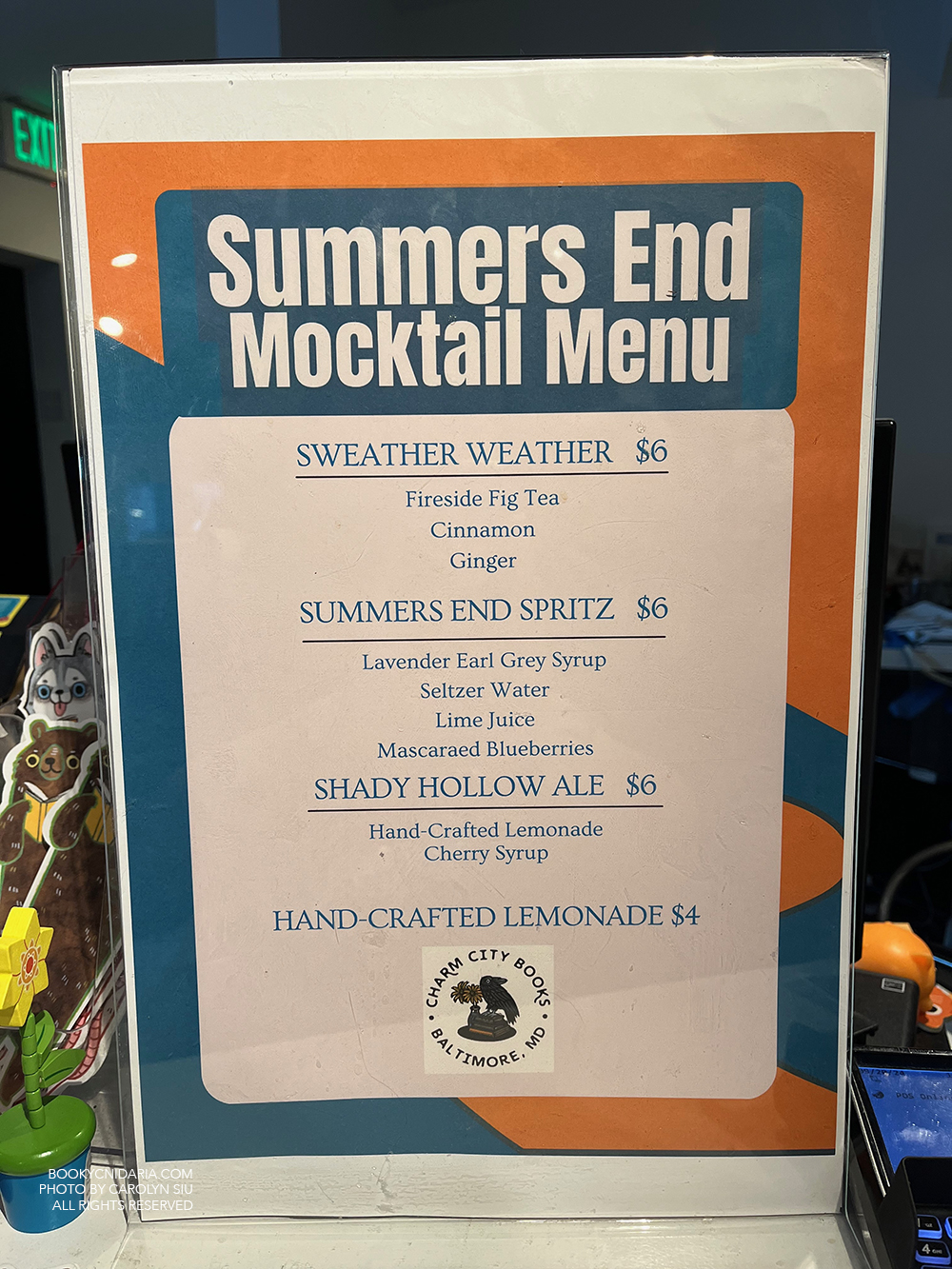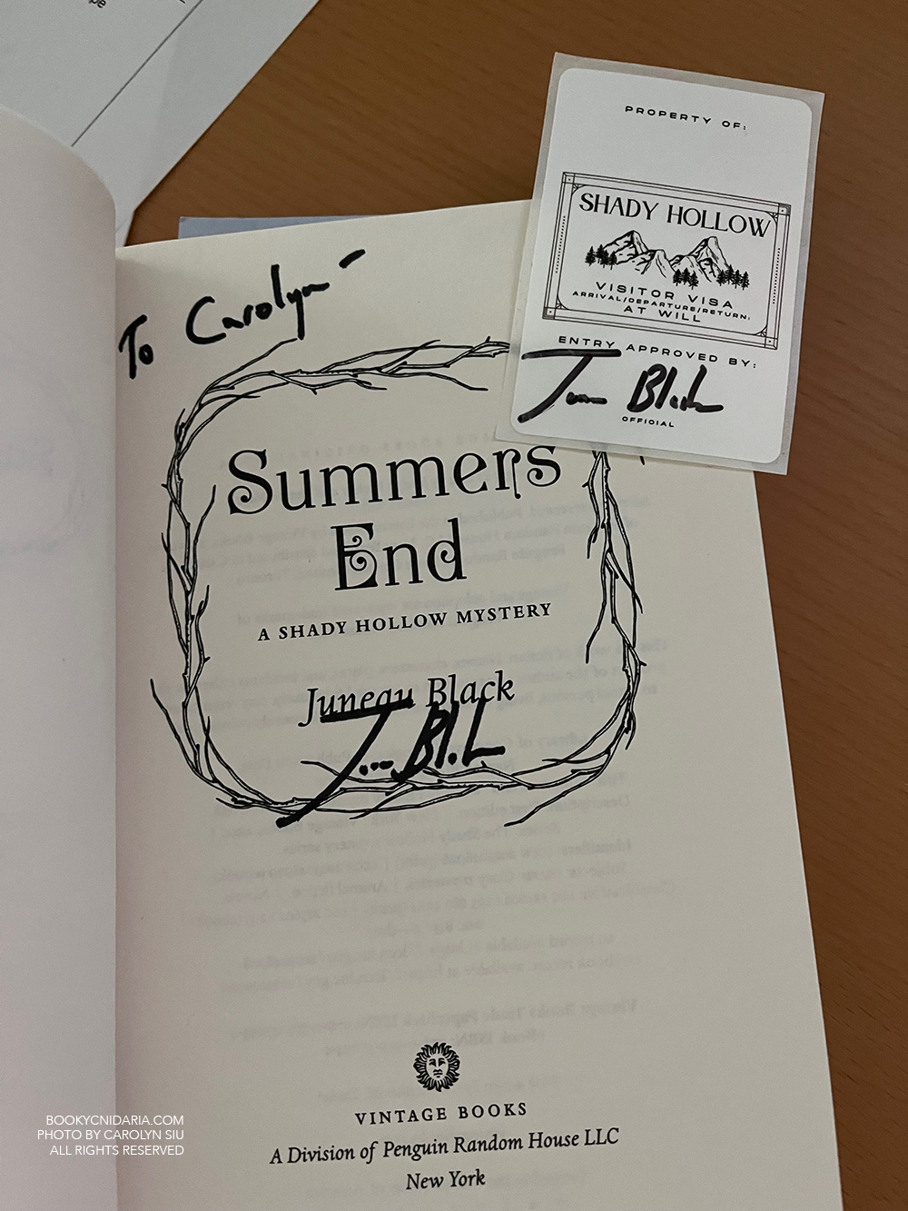 September 20 was a big day partly because of job loss, but mostly because I fulfilled a relatively new lifelong dream and ACTUALLY GOT TO MEET HALF OF JUNEAU BLACK OMG. Juneau Black is a pseudonym representing two authors, Jocelyn Cole and Sharon Nagel, who together have created the best cozy mystery series I’ve ever read. I therefore jumped at the chance to meet Jocelyn, who came to Baltimore for a book signing and murder mystery party hosted by Charm City Books. Despite the two Very Scary Good Boy Guards protecting the store, I did manage to get in and get my book signed; and, since I’d mentioned that Mirror Lake is my Shady Hollow fall favorite, Jocelyn kindly gave me a signed bookplate as well.