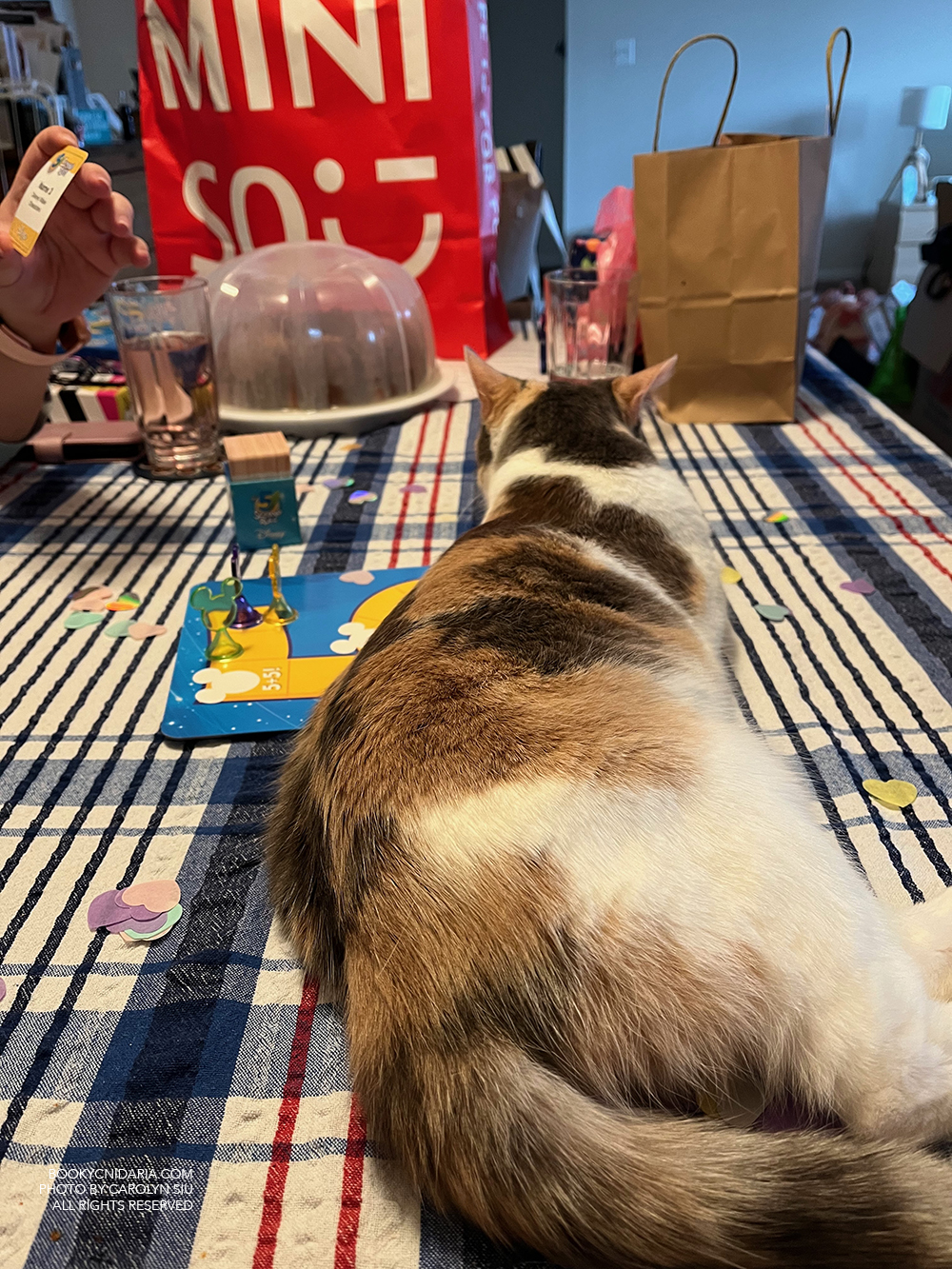 Heather and Michaella came over the day after the family dinner for our traditional joint bday potluck and damn was the cat unhappy. She is by nature solitary and mostly independent, though she does appear to enjoy and even seek out my company, and two rounds of guests in as many days was just too much for her. She is normally quite friendly with Heather and Michaella, but this party was the straw that broke the kitty’s temper, and she made her displeasure plain. (To which I say buck up buttercup, we don’t entertain that often.)