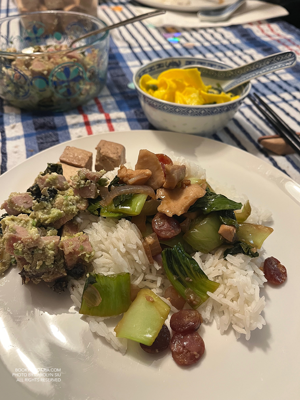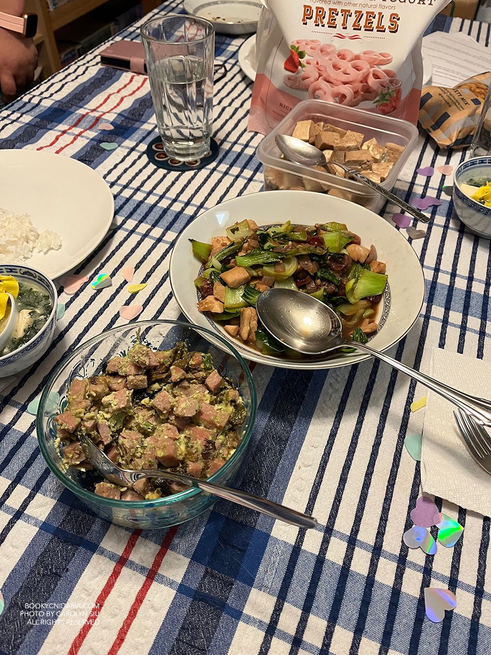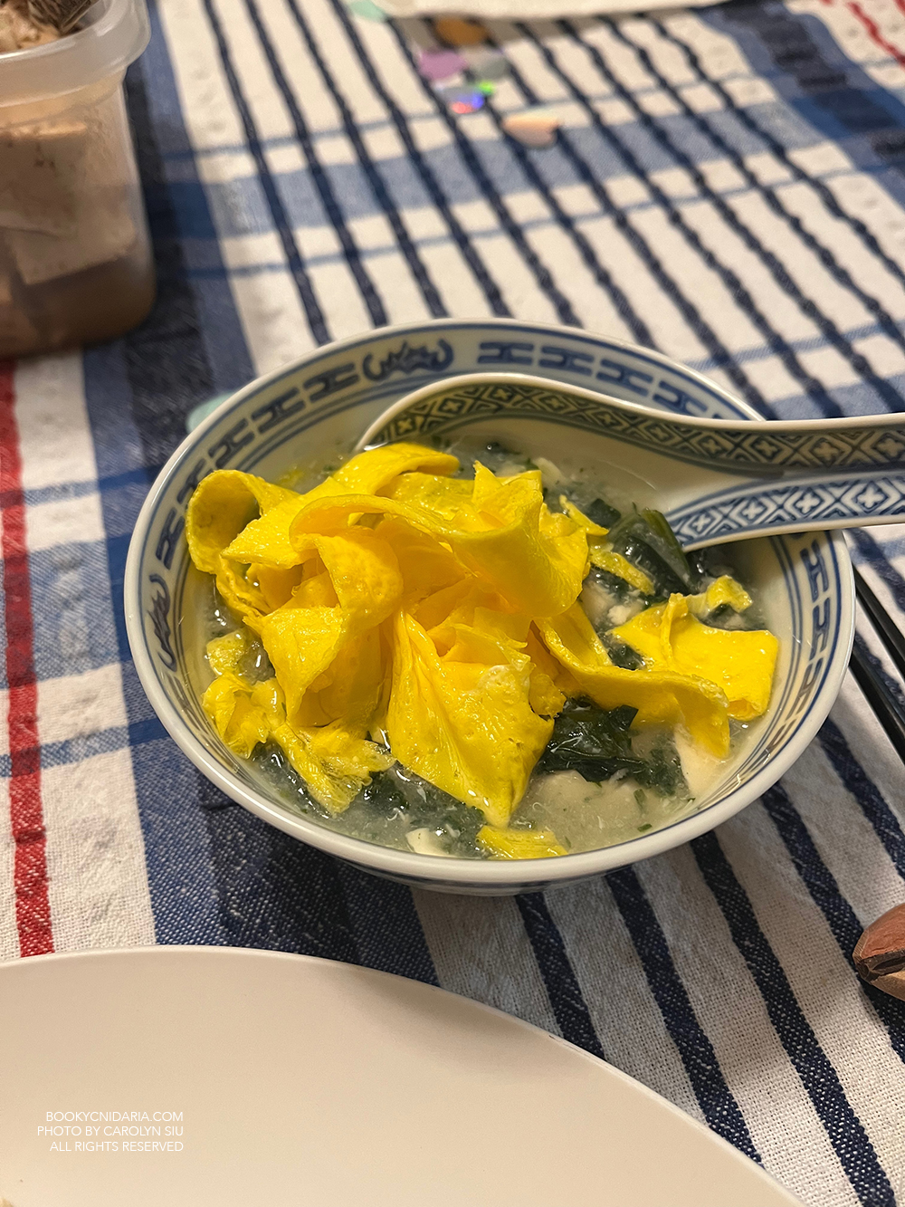Anyway, we played some games but as usual broke all the rules, and we had a good potluck. Those strawberry yogurt pretzels brought by Michaella are my new favorite snack, and I am going to have to see if I can buy them somewhere other than Costco. As well as the stir-fried chicken and bok choy, I made a spinach and tofu soup which normally is supposed to use Shepherd’s Purse which I could’ve sworn I had but all I could find in the freezer was a bag of spinach. Welp, needs must and spinach is a perfectly fine substitute for Shepherd’s Purse, so at the very least I was able to clear the spinach out of the freezer. I also had a tub of my family’s strengthening soup (supercharged chicken stock that has surprising healing properties), so that went into the soup because we must keep our friends healthy, and, since I had spare egg yolks left over from the egg white drizzle, I added omelet shreds as a garnish. The soup was fine, but next time I need to add more salt.