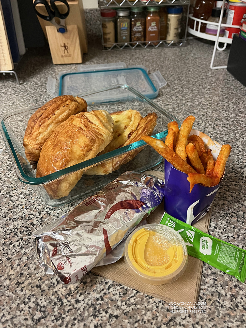 - Two chocolate croissants and a bacon gruyère pastry picked up on my first trip to my local Roggenart which I had no idea existed until recently even though I’ve lived here for three years, and my Taco Bell DoorDash because I was finishing 1984 that night and I needed something to cheer me up