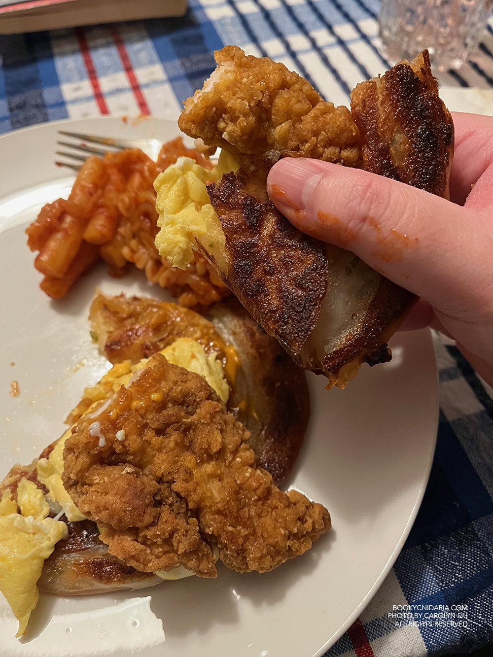 In order from left to right: fried chicken scallion pancake wrap (made with frozen chicken tenders and frozen scallion pancakes, needed to clear those scallion pancakes out of the freezer); Hong Kong scrambled eggs with Spam, which came out a lot better than that time I tried it with leftover takeout chicken; and crazy spicy buldak noodles, tempered with peanut butter. TikTok got unbanned just in time for me to ask it how to make the peanut butter buldak, which in the end came out fine. I’ve already made it again, though following my usual method for Fujianese peanut noodles instead. I liked the second iteration better but it’s spicy as fuck either way and I got a few organs that will never be the same, so tread cautiously.