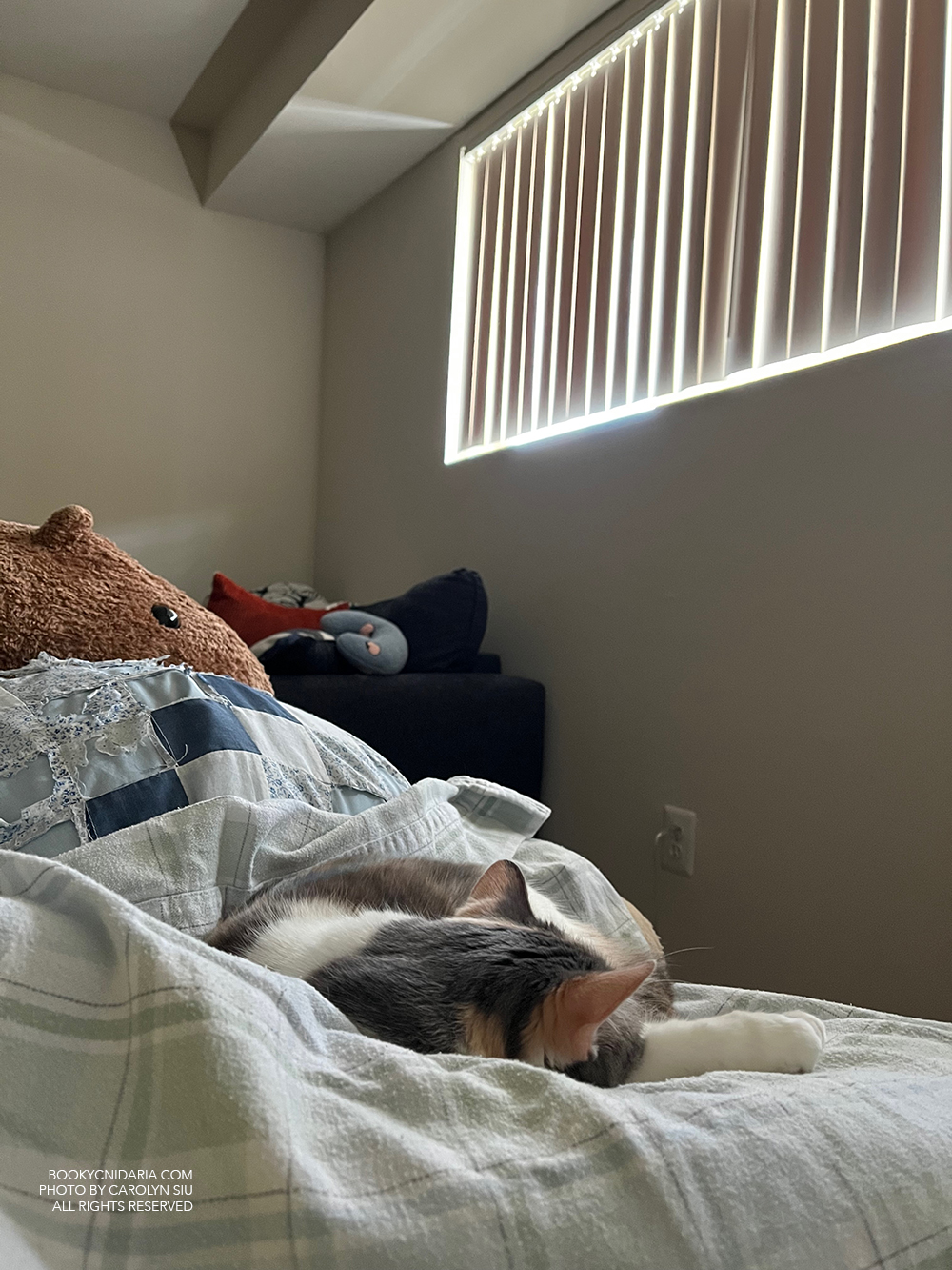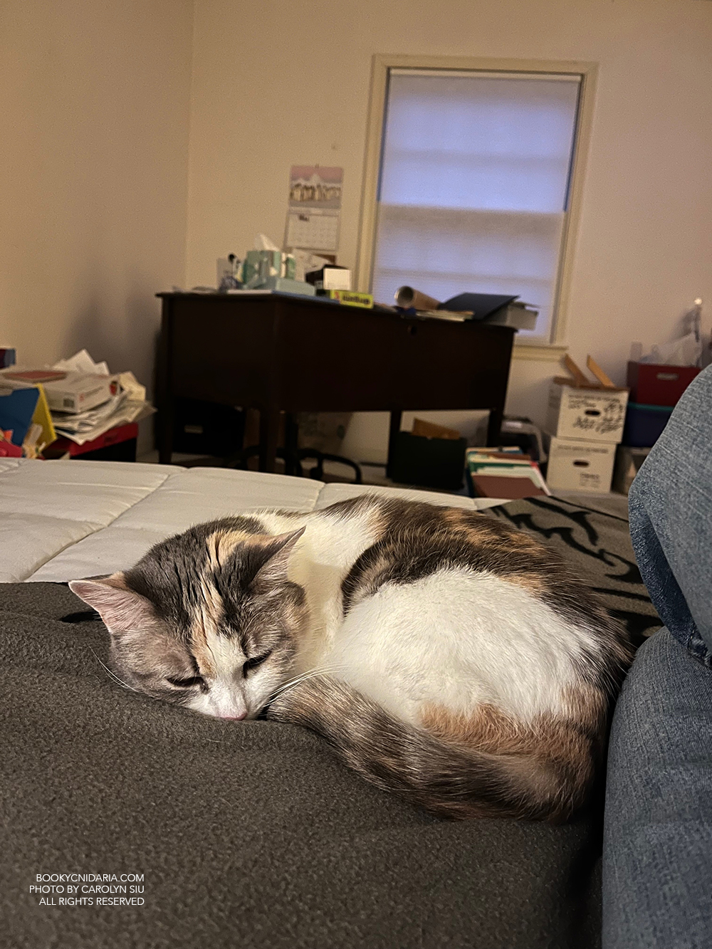 Anyway, here’s all the shots that didn’t make it into the post above, starting with that damn unsub trying to destroy the tassel on a bookmark that she’d already partially dismantled, curse her, and I’m starting to think the two incidents might be related. She’s currently working on the bookmark I’m using with Foul Lady Fortune. I’ve really gotta stop buying bookmarks with tassels. Same unsub later seen napping comfortably in various spots around the apartment, bold as brass. She really doesn’t have a single thought in that fuzzy little head. Must be nice.