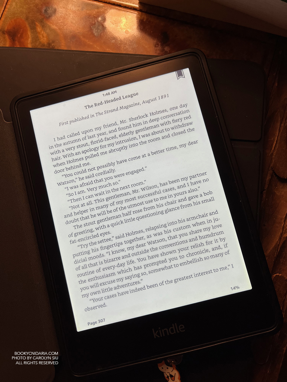 Finally finished The Sign of Four, which I did not particularly care for, and am now working my way through the short stories. The highlight of my reading life was finding out that this copy of Holmes finally includes page numbers, at least on my new Paperwhite. They still don’t show up on the old Paperwhite, and I’m going to see if I can get a software update or something because I need my page numbers. This shouldn’t even be a debate at this point. GIVE. EBOOKS. PAGE NUMBERS.
