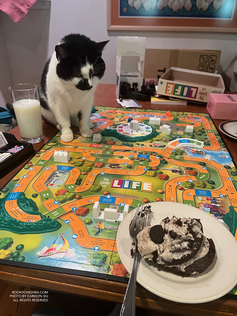 After dinner we grabbed Crumbl cookies and then went home to play Life because dammit it’s been a while and I originally wanted to play Life at the holiday gift exchange but couldn’t find it. We had to play around Hato for a while but eventually she got bored and left, or I kicked her off the table, I actually don’t remember which. Oh and also I somehow ended up with a vanful of daughters and I’m still annoyed, but at least I retired obscenely rich. As with the Monopoly game, we forgot all the rules and we played wrong, so I’m not sure our final net worths should actually count.