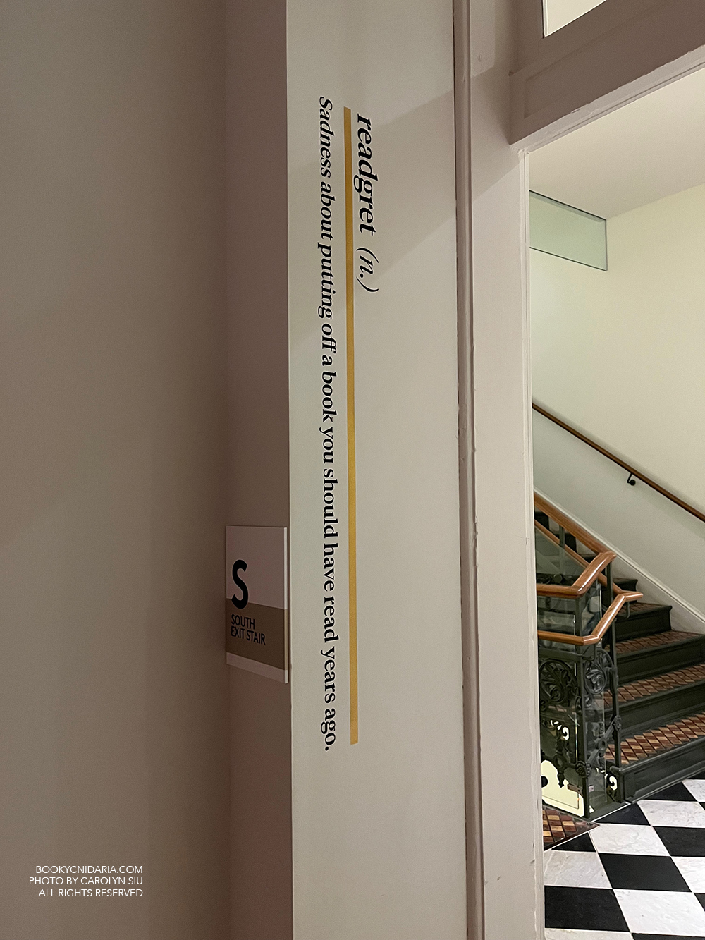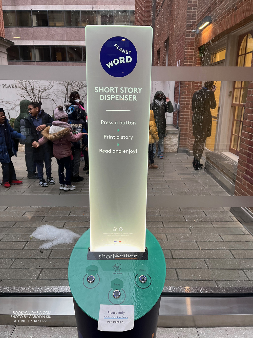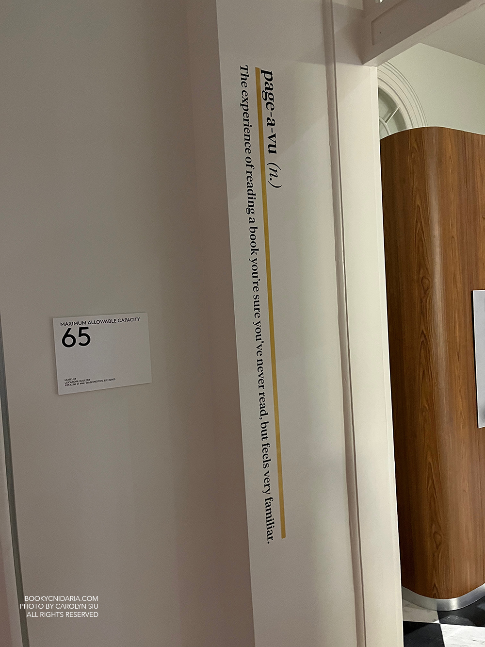 I had never heard of Planet Word before Heather told me about it, and now I am indignant that this place is not a household name. Planet Word is nothing more nor less than an independent museum at the historic Franklin School in DC, and it is AMAZING. From the short story dispenser in the lobby to the interactive language lectures to the karaoke room where they analyze the lyrics on the screen to the rude writings all over the bathroom walls, this place is a must-visit for anyone who loves words and anyone who wants to learn to love words. I was geeking out by the time we got on the elevator, whose walls were designed to look like bookcases.