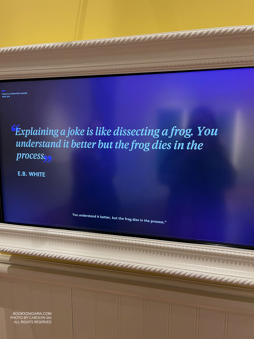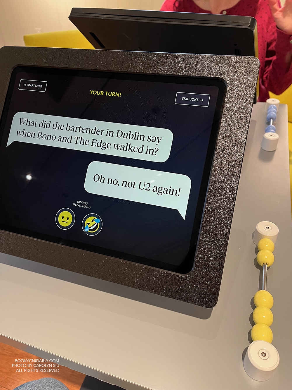 My favorite exhibit was hands down the humor room, which includes several game stations where you and a friend can take turns reading each other jokes (Heather won), and where we tried to teach a computer to caption a cartoon. Second favorite was the karaoke room, though I kinda wish it would’ve played the whole song instead of cutting off halfway through. We started with Moana but went straight to “Hey Ya!” after that, because what kind of American Millennials would we be if we didn’t. I find it hilarious that the room had nothing to say about the actual “Hey Ya”s, lol. Third favorite room: the gift shop, where I managed to limit myself to one magnet and one pin.