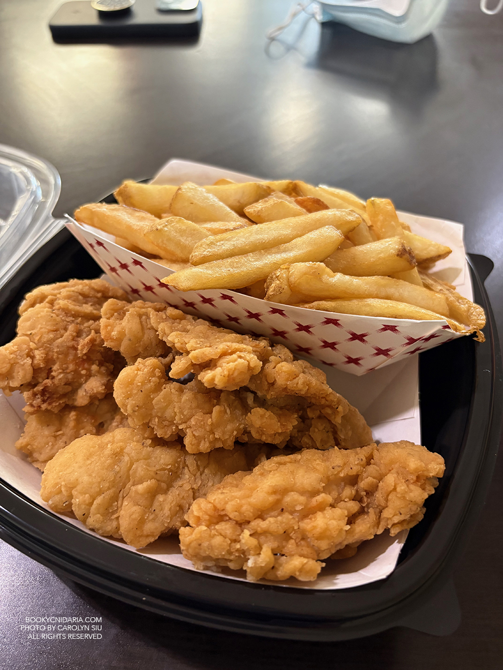 A rare outing: I got to visit with my friend Lauren, who went through the same bullshit I did, and she got me a box of chicken fingers. My friends have been taking such good care of me. :’D