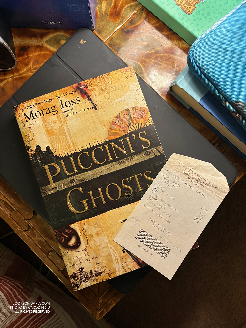 In general this was a month of rereads: The Midnight Library was new, but the other three were all known to me. I used to love Island of the Blue Dolphins when I was little, and I don’t know what put it back on my radar but I got a craving one day and ended up borrowing it on Kindle. The other surprise craving was Puccini’s Ghosts, seen here with the 2010 Barnes & Noble receipt I found tucked into it when I pulled it off the shelf. The receipt was a surprise as well: for some reason I thought I bought the book a lot earlier than 2010. As for the book itself, it was exactly as bad as I remembered but somehow I just can’t bring myself to get rid of it.