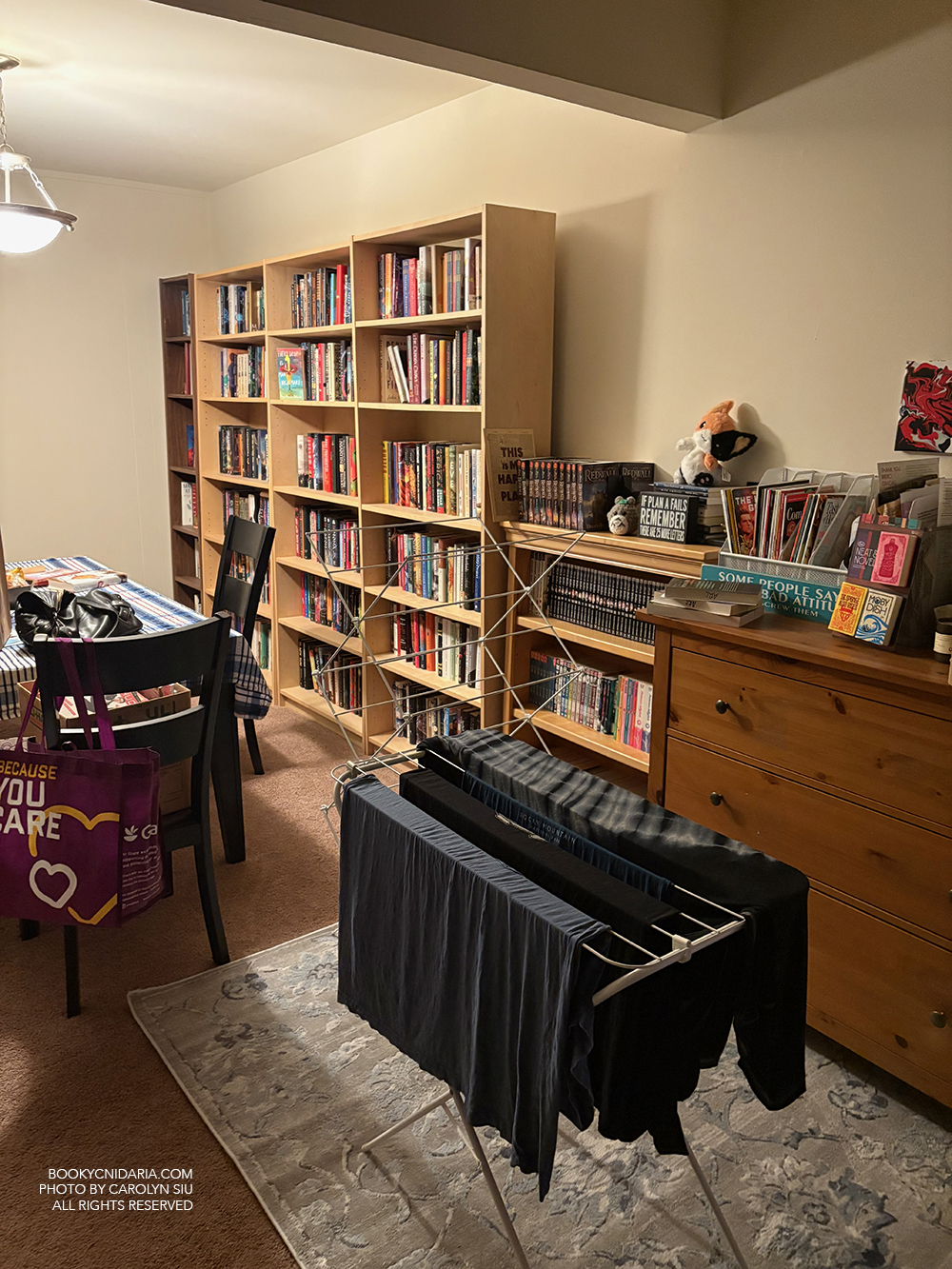 There are two wolves inside me. One wants to move the bookcases and the other one says wE ARE NOT DISCUSSING THIS WHAT IS WRONG WITH YOU ASD;DFJFJKDJFLER. For context, these are the bookcases, and I want them to swap places with the linens dresser. No, I don’t know what’s wrong with me. Will bookcase-moving actually happen? I don’t know that either.