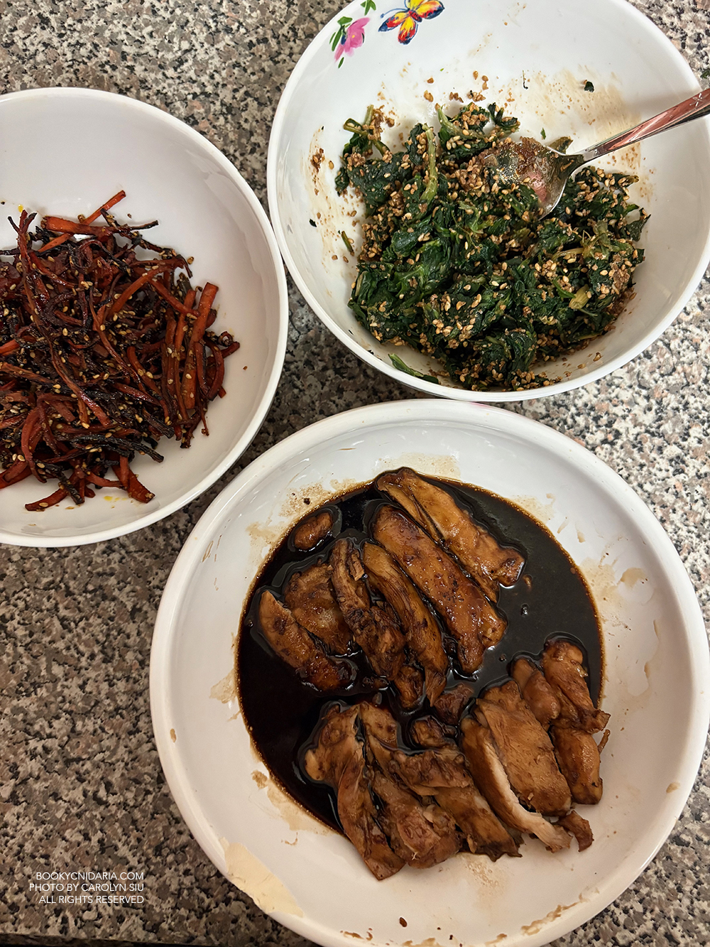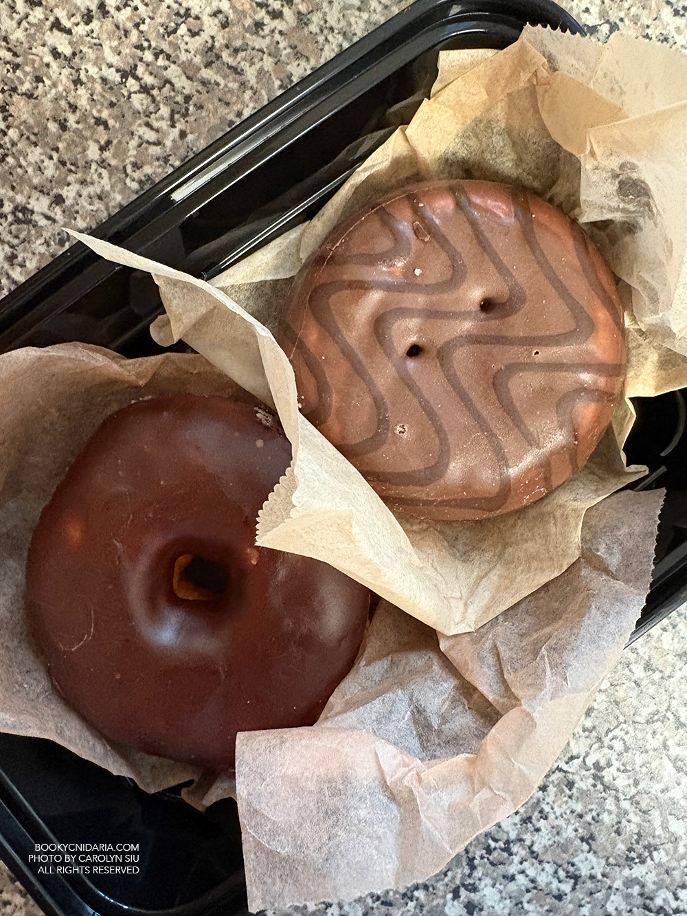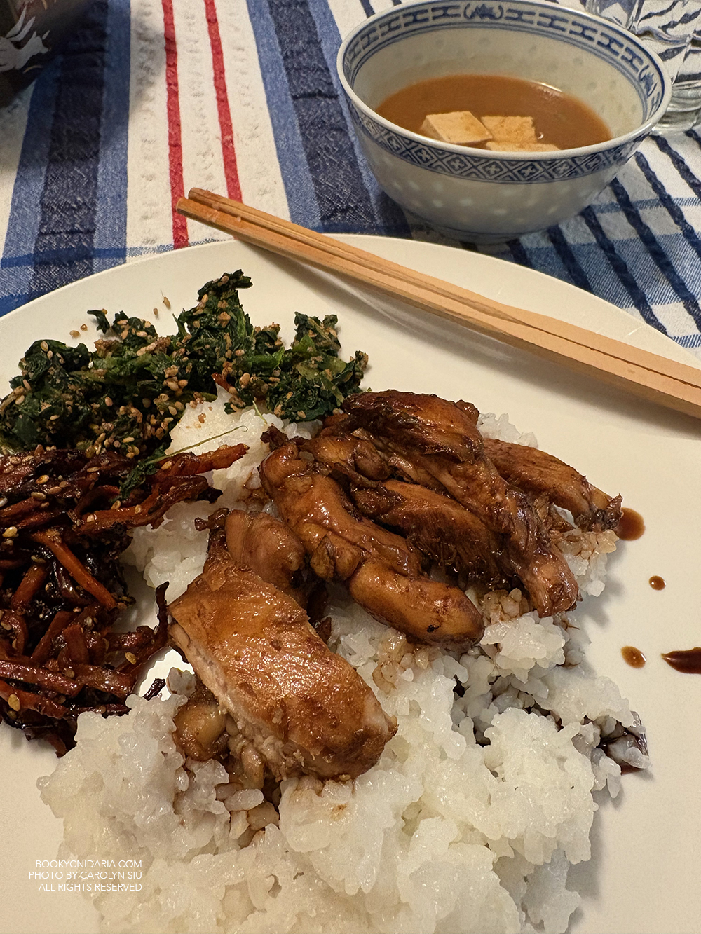 My birthday happened to fall on a weekday and I was working, and half my family was gone for most of the month anyway, so it was a solo celebration this year. I managed to get a ruined activity book for free and indulged with a couple of books and some bakery treats. Those kimchi croquettes are delicious, and I am newly addicted to the chocolate-filled chocolate chip cookies. For dinner I rolled out my mom’s old teriyaki chicken, which I haven’t made in maybe a decade. That sauce did not thicken up the way I remember it doing in college. I sure hope I can find the printed recipe, which I’m pretty sure I have because I do remember recording it for myself before I got my first kitchen. It’s such a simple recipe that it’s stayed stuck in my head all these years and I’m not really sure what went wrong. It was still as good as I remembered it, though. With the chicken I had spinach gomaae (note to self: next time use more spinach) and kinpira carrot with the extra sesame dressing from the spinach. The spinach marks the first time I used my mortar and pestle for something other than cat meds. I also got my favorite chocolate cake slice from Wegmans, and later I found out that Lidl would give me a free birthday treat. The extra donut was not free, but it was cheap and I couldn’t decide which one I wanted so they both hopped into my bag.