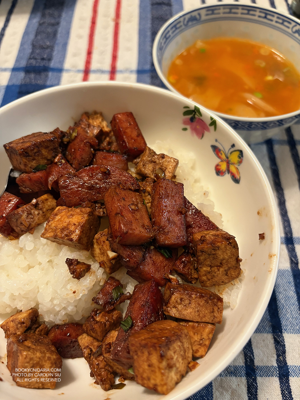 - Stir-fried tofu and Spam. The first thing cooked in that pan I stole from my mom last month.