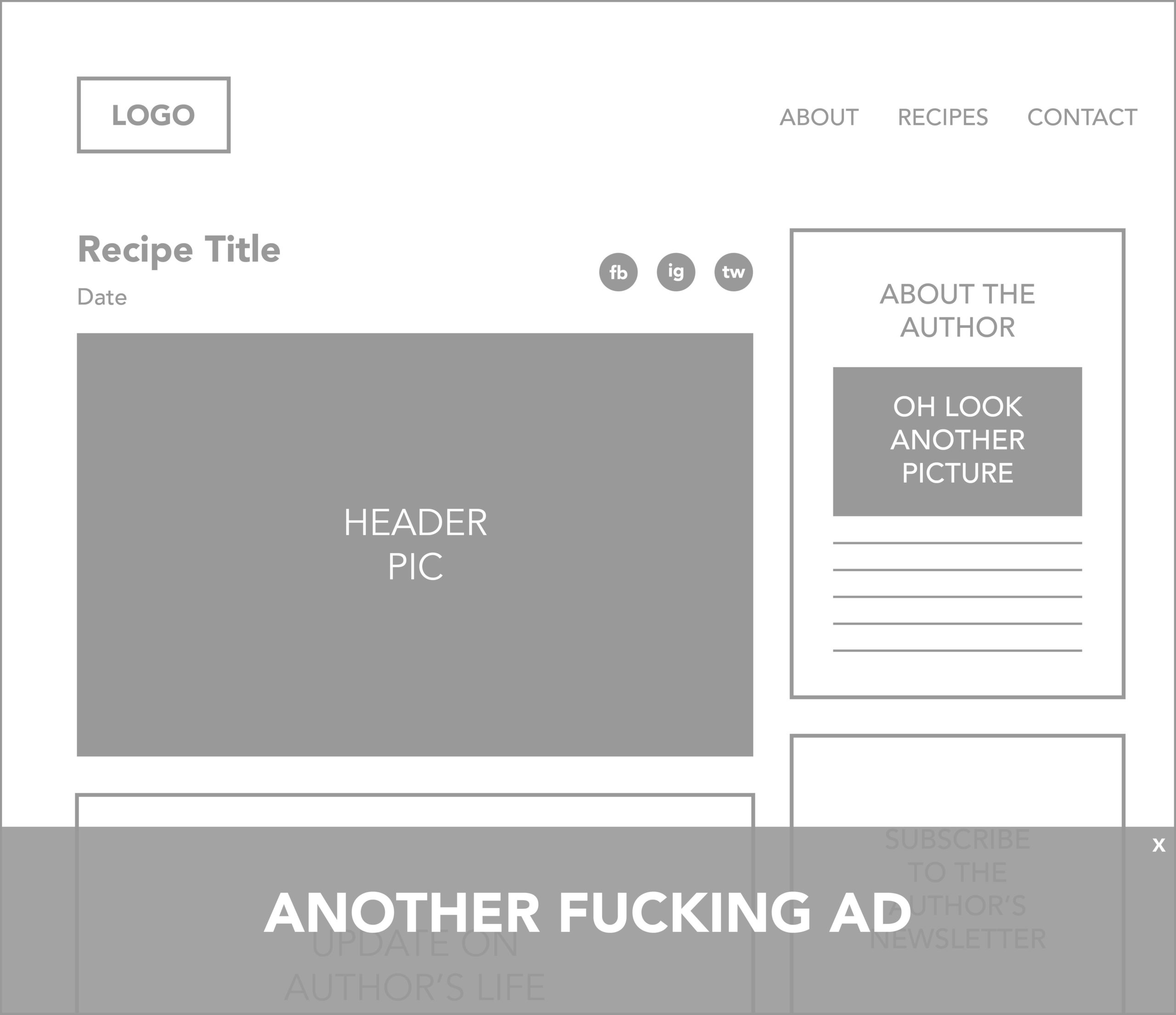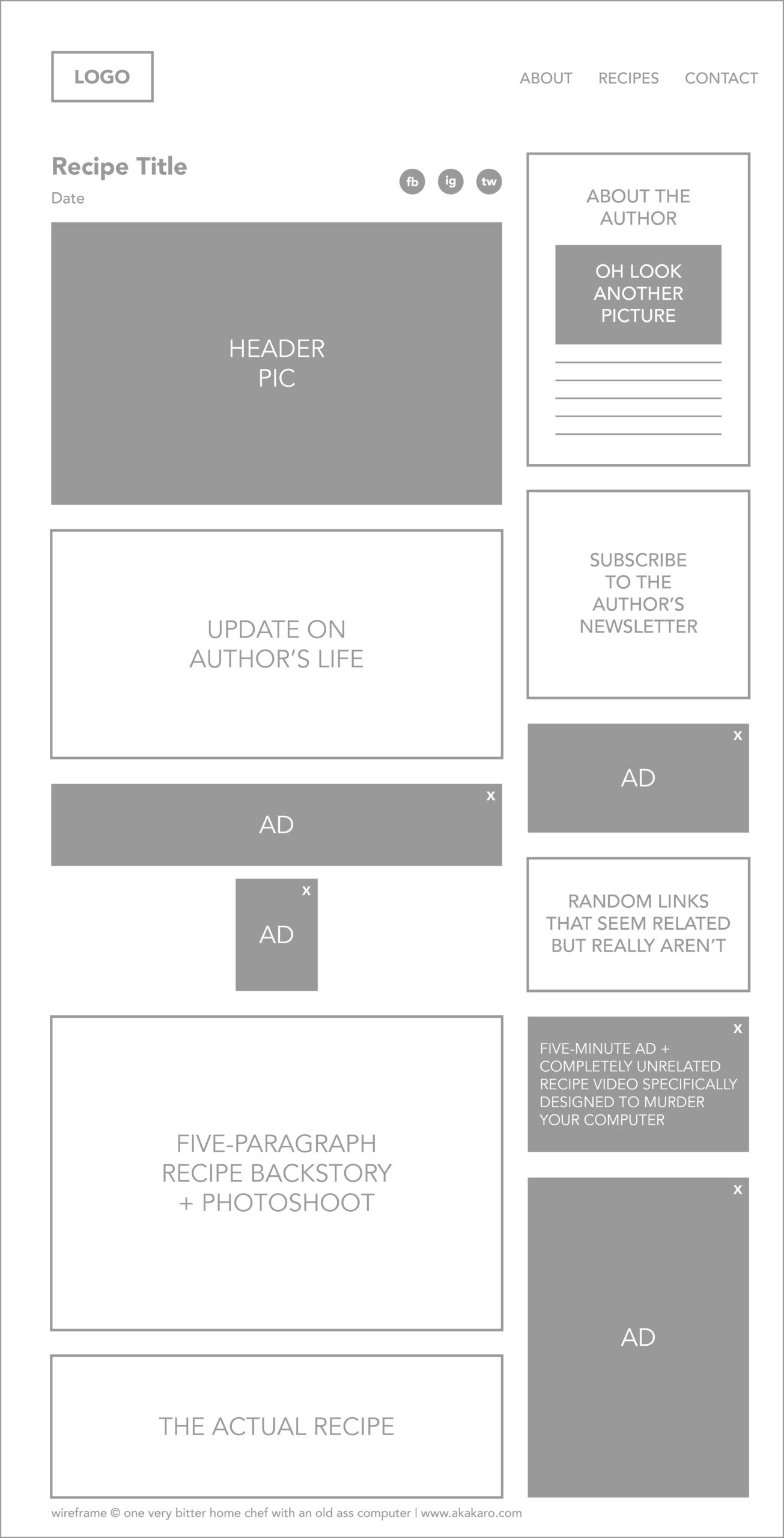 Anyway. I love food blogs but there are days when I find them le rage-inducing, and this was one of those days. I have a very long list of Things That Do Not Amuse Me, but one of the top ones is cooking blogs that are so bogged down with ads and fucking autoplay videos that they literally SHUT DOWN MY COMPUTER.