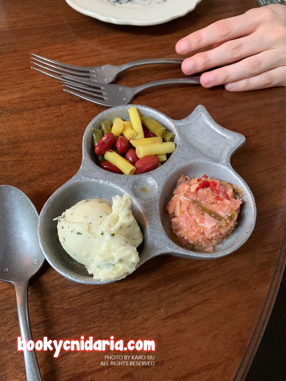 We started with Sally Lunn bread and YOMMMMMM. It was served with a kind of herby butter, pickled beans, and something that I think they called ham relish? It didn’t sound like a great idea, but it sure tasted amazing.