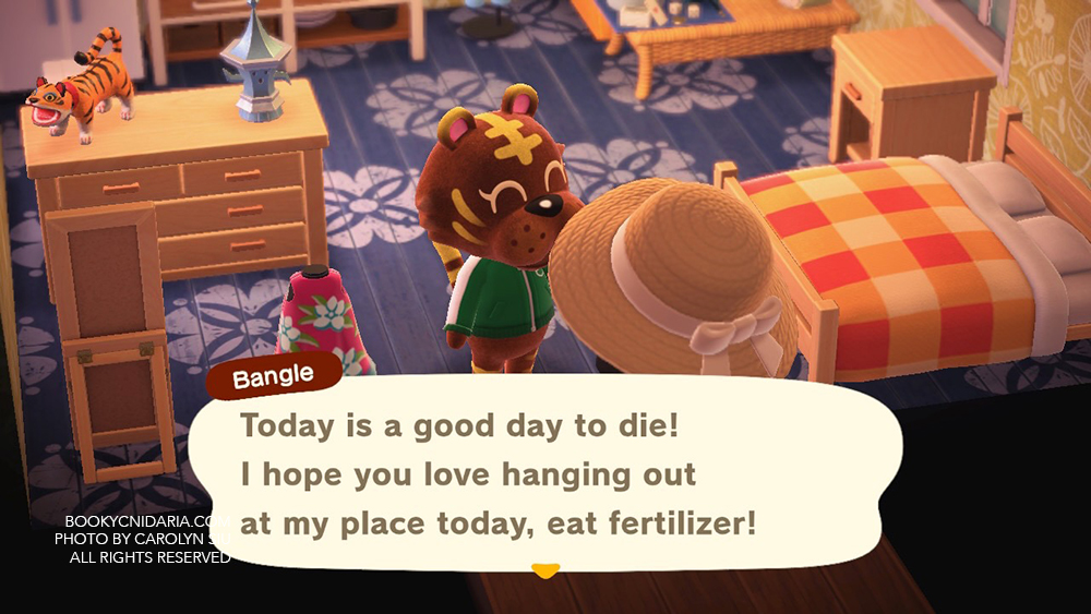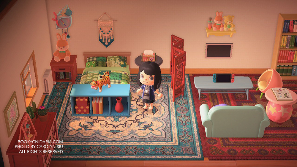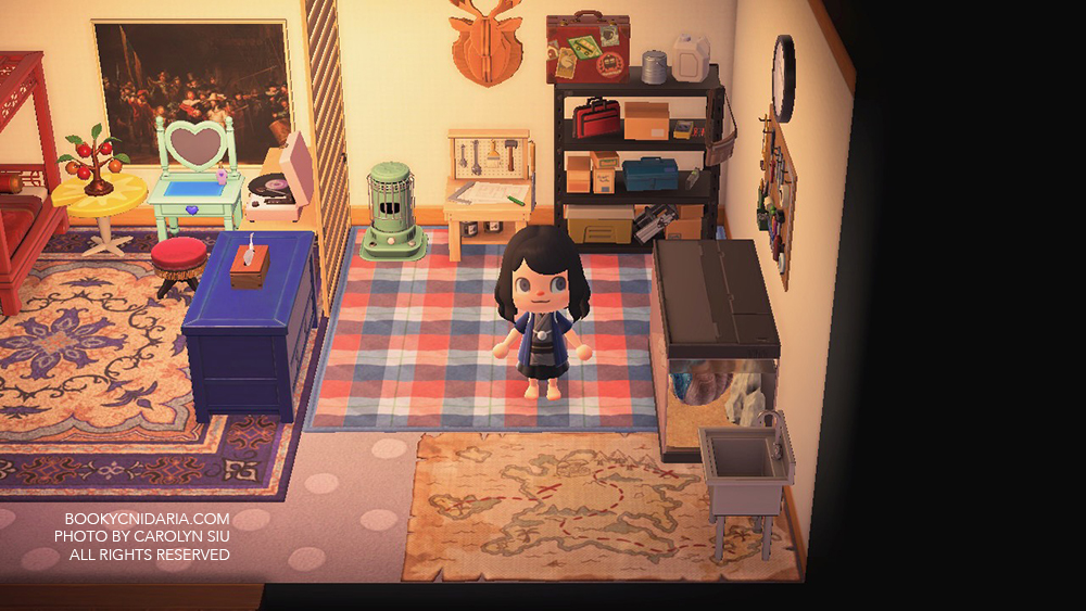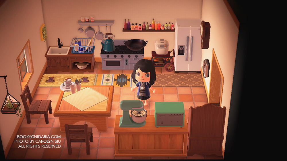 I have two bookcases!!! The one I stole from Merengue is still in my bedroom, and I made a second one for my office. Totally not me projecting all my dreams into a fake house that I’ll never set foot in irl. Also it is surprisingly irritating to procure enough books in ACNH, but I found out through sheer chance that I can search the Nook online store for things it has sold in the past, even if they’re not offered in the daily catalogue. Thus I was able to order five books with no shame, and now I have two bookcases. The mini fridge, in my loving imagination, is stocked with bottled juices. Probably mostly lemonade, with maybe a few bottles of homemade apple juice.