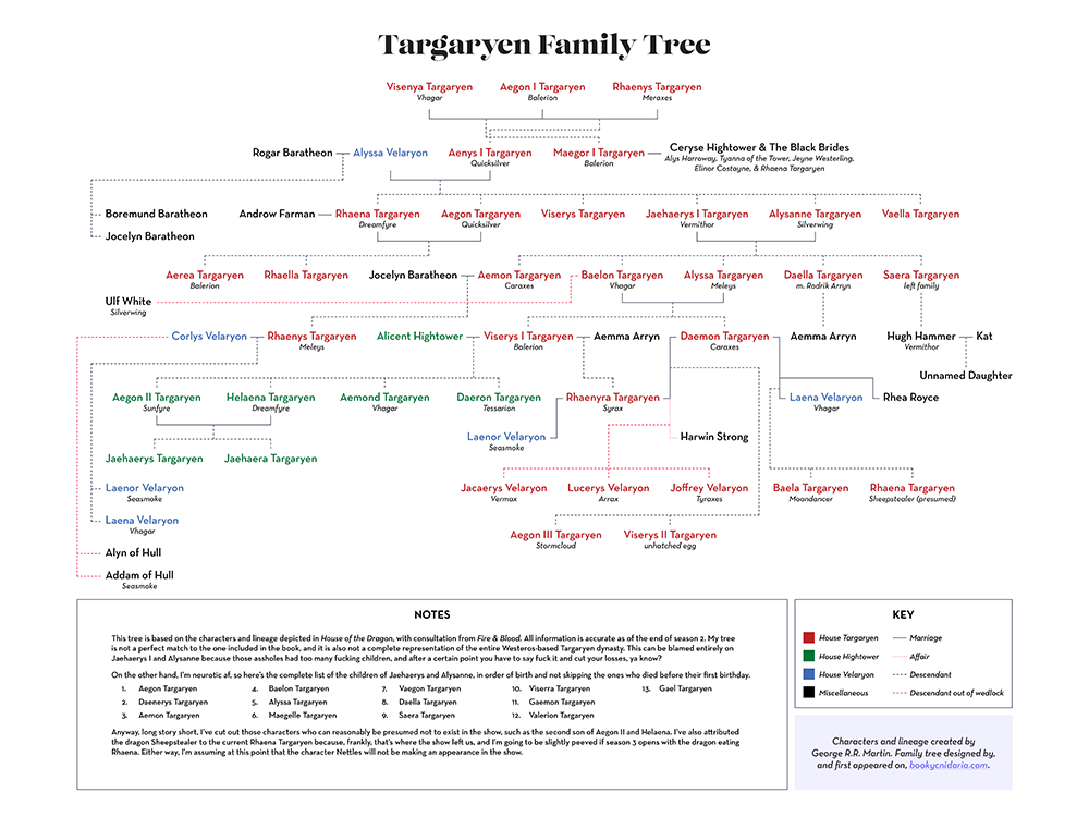 This was a busy season, and I’m having a hard time organizing my thoughts well enough to summarize it. My season 1 recap broke the synopsis into chunks by episode, but this season it seems more practical to break it down by family. As in the family tree above, Alicent’s children will be treated as members of House Hightower even though their surname is Targaryen. They’re called the greens for a reason. And also I can’t say their father ever really spent a lot of time with them.